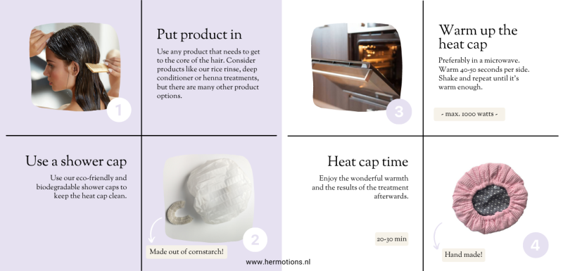 A heat cap is a microwavable cap filled with flaxseed. The hair scales open due to the heat and the product can absorb better. You can use this cap while you are moving freely. Perfect for our busy life.